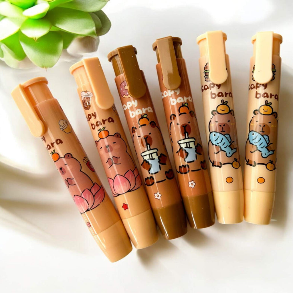 Descubre el Borrador Retráctil Capybara, la herramienta perfecta para corregir tus errores con precisión y comodidad. Su diseño retráctil protege el borrador cuando no está en uso, manteniéndolo limpio y listo para usar en cualquier momento. Ideal para estudiantes y profesionales que buscan practicidad y eficacia en un solo producto. Dale un toque divertido y funcional a tu escritorio con este borrador único. ¡Corrige sin complicaciones y con estilo!